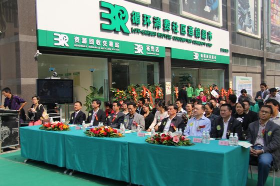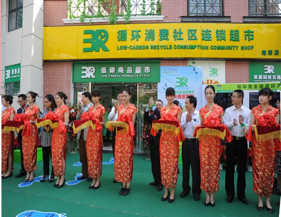2011年10月18日上午,全國首家以循環(huán)消費(fèi)為主題的“3R循環(huán)消費(fèi)社區(qū)連鎖超市”(3R店)在湖北省武漢市和荊門市兩地三店隆重開業(yè)。自此,國內(nèi)第一家集合低碳商品銷售、二手商品寄賣及再生資源交易與循環(huán)利用于一體的新型循環(huán)消費(fèi)超市正式在湖北閃亮登場,標(biāo)志著一個改變居民生活方式的循環(huán)消費(fèi)商業(yè)模式的誕生!湖北省政府郭生練副省長、武漢市人大常委會副主任鄭永新、荊門市委常委、副市長胡道銀、荊門市人大常委會副主任賀明海、荊門市政協(xié)副主席文觀云,湖北省商務(wù)廳、荊門市政府、省、市有關(guān)部門領(lǐng)導(dǎo)以及中央、省市媒體代表和社區(qū)居民、學(xué)生代表共300余人分別在武漢、荊門兩地出席了此次開業(yè)慶典。